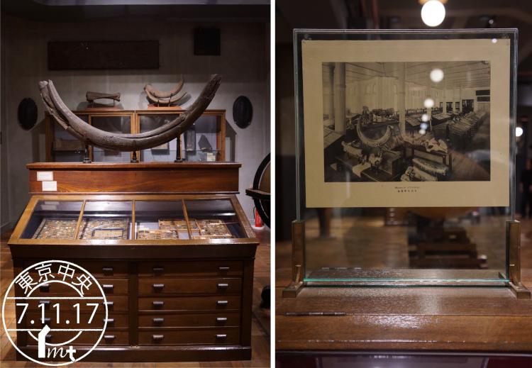 インターメディアテクの2F、骨の並ぶ壁際のケースを辿って行くと、貝類を収めた斜めケースがある。の上に、分厚いガラスで挟んだ古い写真が展示されている。これは東京帝国大学時代の教室や列品場を撮影したものだ。列品場とは各部門が持っていたミニ展示室である。かつては神田に大学の博物場があったのだが、残念ながら関東大震災によって消滅した。写真にある博物場はその後のもの、おそらく昭和初期の姿であろう。さて、その中に地質学教室列品室の写真があり、多くの化石が写っている。ひときわ目をひくのが大きく湾曲した何かーー形状からしておそらくゾウの牙である。細長い木製台座と3本の支柱で支えられている。さて、この写真を見たあと、顔を上げて正面を見て頂きたい。大地球儀の後ろに、まさにその標本が展示してある。マンモスの牙の化石であることは判明しているが、残念ながらそれ以上は未詳である。